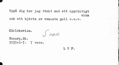 //// ¦ I //// Uppå dig har jag tänkt med ett uppriktigt //// sinn //// och ett hjärta av renaste gull o.s*v. //// i ¦ //// i i //// Kärleksvisa. //// J //// Bosarp,Sk. 323556-7* 7 vers. //// L U F. , //// i i //// k ////