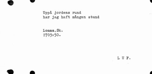 //// Uppå jordens rund //// har jag haft mången stund //// Lomma,Sk. 2703:50. //// L U F. ////