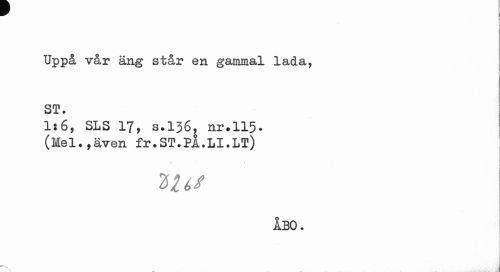 //// J //// Uppå vår äng står en gammal lada, ST. //// 1:6, SLS 17, 3.136, nr.115. (Mel.,även fr.ST.PÅ.LI.LT) //// Ult I //// ÅBO. //// i ////