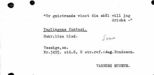 //// rtUr gnistrande vinet din skål vill jag //// dricka //// Ynglingens fantasi. Hskr.lösa blad. //// Yessige, sn. //// Ir.3495 > sid.8, 8 str.ref.:Aug.Bondeson. //// VARBERG MUSEUM. ////