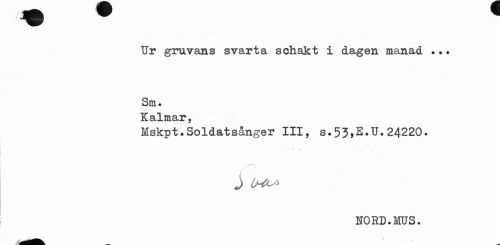 //// Ur gruvans svarta schakt i dagen manad . •. Sm. //// Kalmar, //// Iskpt.Soldatsånger III, s.53,E.U.24220. //// NORD.MUS. ////