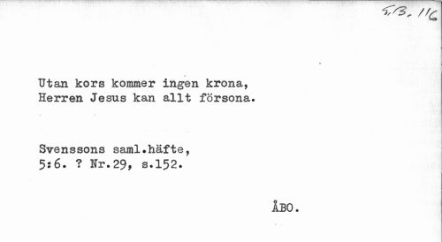 //// v //// Utan kors kommer ingen krona, Herren Jesus kan allt försona. //// Svenssons saml»häfte, //// 5:6. ? Hr.29 > s.152. //// ÅBO. ////