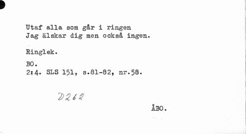 //// f //// Utaf alla som går i ringen Jag älskar dig men också ingen. //// Ringlek. j //// BO. //// 2$4. SLS 151, s.81-82, nr.58. //// 1 //// i //// ÅBO. //// ... ////
