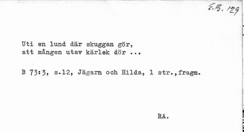 //// Uti en lund där skuggan gör, att mången utav kärlek dör ..? //// B 73*3* s.12, Jägarn och Hilda, 1 str.,fragm. //// i - //// RA. j ////