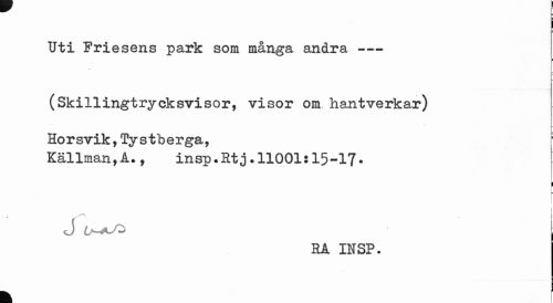 //// Uti Friesens park som många andra -- //// [ //// (Skillingtrycksvisor, visor om hantverkar) Horsvik,Tystberga, //// Källman,A., insp.Rtj.11001:15-17* //// i //// [¦ //// i i //// J //// RA INSP. //// k ////