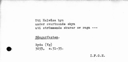 //// \ //// Uti Halvåsa byn //// under svartnande skyn //// uti strömmande skurar av regn --- //// Sångarfesten» Ryda (Yg) //// # 3033, s.31-35. //// X • IP * Gr # H # ////
