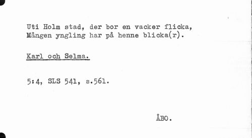 //// > //// Uti Holm stad, der bor en vacker flicka, Mången yngling har på henne blicka(r). //// Karl och Selma. //// 5»4, SLS 541, 8.561. //// ÅBO. //// k ////