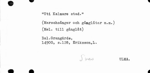 //// "Uti Kalmare stad." //// (Marschsånger och gånglåtar m.m.) (Mel. till gånglåt) //// Dal.Grangärde, //// 14900, s.128, Eriksson,!. //// J WU) ULMA. ////