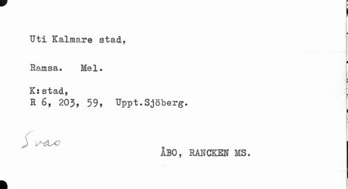 //// I //// L ¦ //// Uti Kalmare stad, //// i //// Ramsa. Mel. //// ¦ //// K: stad., //// E 6, 203, 59, Uppt.Sjöberg. //// j l^O . //// ÅBO, RMCKEN MS. //// k ////