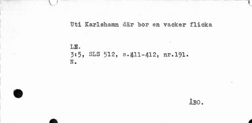 //// Uti Karlshamn där bor en vacker flicka LE. //// 3:5, SLS 512, s.411-412, nr.191. I. //// ^ ÅBO. ////