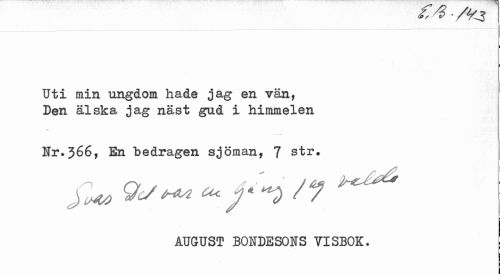 //// I //// Uti min ungdom hade jag en vän. Den älska jag näst gud i himmelen //// Hr.366, En bedragen sjöman, 7 //// £U* 9a ^ cu /y //// k //// AUGUST BONDESONS VISBOK. //// I ////