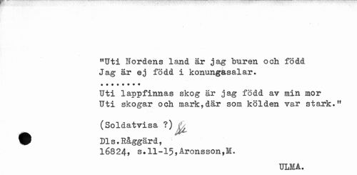 //// "Uti Hordens land är ja g buren och född Jag är ej född i konungasalar. //// Uti lappfinnas skog är jag född av min mor Uti skogar och mark,där som kölden var stark." //// (Soldatvisa ?) //// 16824, s.11-15,Aronsson,M. //// ULM A. ////