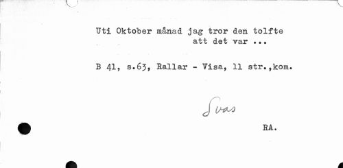 //// Uti Oktober månad jag tror den tolfte //// att det var ••• //// v. . -w* //// B 41> s.63, Rallar - Tisa, 11 str.,kora. //// J LHM ////