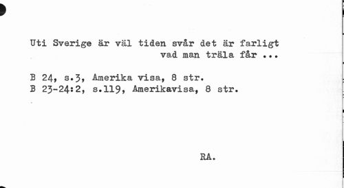 //// t I //// i //// Uti Sverige är väl tiden svår det är farligt //// vad man träla får •.. //// i //// B 24» s.3, Amerika visa, 8 str. B 23-245 2, s.119, Amerikavisa, 8 str. //// 1 //// RA. ////