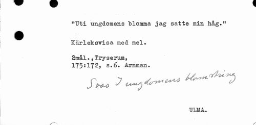 //// "Uti ungdomens blomma jag satte min håg.11 //// Kärleksvisa, med mel. //// Smål.,Tryserum, 175:172, s.6. Amman. //// ULMÅ. ////