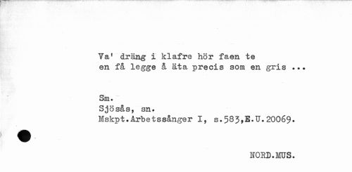 //// 7a1 dräng i klafre hör faen te //// en få legge å äta precis som en gris ... //// Sm. //// Sjösås, sn. //// Mskpt.Arbetssånger I, s.583,1.U.20069. //// A //// NORD.ros. ////