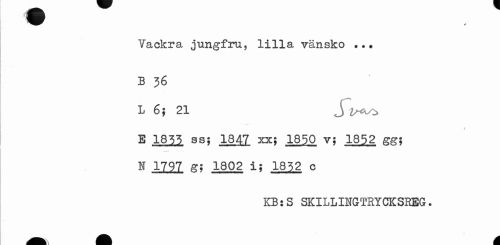 //// Vackra jungfru, lilla vänsko B 36 //// L 6; 21 J //// / //// ® ss; 184? xx; 1850 v; 1852 gg; //// N 1797 g; 1802 i; 1852 c //// KB:S SKILLINGTRYCKSHEG. ////