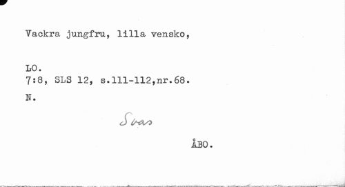 //// Vackra jungfru, lilla vensko, LO. //// 7:8, SLS 12, s.111-112,nr.68. H. //// c) irtasy //// ÅBO. ////
