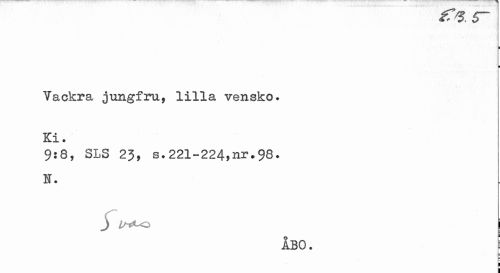 //// r, 5. 6 //// i ¦ //// Vackra jungfru, lilla vensko. Ki. //// 9:8, SLS 23, s.221-224,nr.98. N. //// J Is*to | //// = //// ÅBO. i //// P i ////