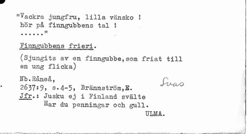 //// "Vackra jungfru, lilla vänsko ! hör på finngubbens tal l //// rt //// w ™ w w ™ ? » • //// Finngubbens frieri* //// (Sjungits av en finngubbe,som friat till en ung flicka) //// Ib.Råneå, //// 2637:9, s.4-5» Brännström, E. //// Jfr.: Jusku ej i Finland svälte //// Har du penningar och gull. //// ULMÅ. ////