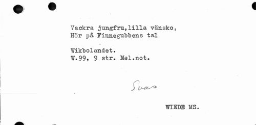 //// Vackra jungf ru,lilla vänsko, Hör på Einnegubbens tal //// Wikbolandet. //// W.99, 9 str. Mel.not. //// # //// WIEDE MS. ////