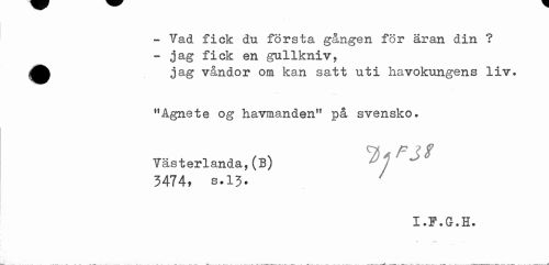 //// - Vad fick du första gången för äran din ? //// - jag fick en gullkniv, //// jag våndor om kan satt uti havokungens liv. //// "Agnete og havmanden" på svensko. Västerlanda,(B) //// 3474? s.13. //// X • I? . Gr . H • ////