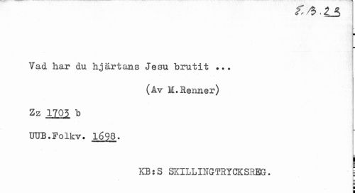 //// g,/9 • z_5 //// ¦ //// Vad har du hjärtans Jesu brutit ? //// I //// (Av M.Renner) //// Zz 1705 b UTJB.Polkv. 1698. //// KB:S SKILLINGTRYCKSREG. \ ////