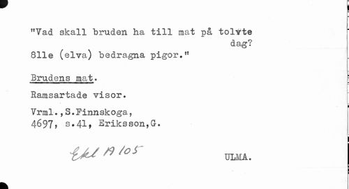 //// "Vad skall bruden ha till mat på tolvte //// dag? //// 811e (elva) bedragna pigor." //// Brudens mat. : //// Ramsartade visor. //// r-! //// Vrml.,S.Finnskoga, 4697? s.41, Eriksson,G. //// f- //// ulma. //// t ////