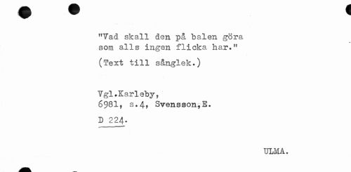 //// flVad skall den på balen göra som alls ingen flicka har." //// (Text till sånglek.) //// Ygl.Karleby, //// 6981, s.4» Svensson^E. //// D 224* //// ULM A. ////