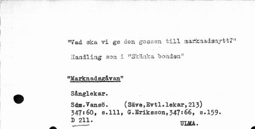 //// "Vad ska vi ge den gossen till marknad snyt t?" Handling som i "Skänka "bonden" //// "Markn adsgåvan" ^ Såm.Tansö* ( Säve,Evtl* lekar, 213) //// 347:60, Still, G.Briksson,347:66, s.159. //// D TTT.MA _ ////