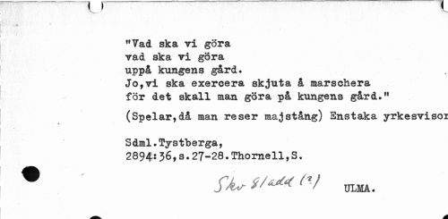 //// fl7ad ska Ti göra rad ska vi göra uppå kungens gård. //// Jo,Ti ska exercera skjuta å marschera för det skall man göra på kungens gård.11 //// (Spelar,då man reser majstång) Enstaka yrkesvisoi //// < ¦ ' //// Sdml. Tystberga, //// 2894-: 56, s. 27-28. Thornell, S. //// A. ^ ////
