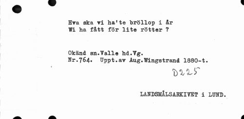 //// t //// Hva ska vi hafte bröllop i år Wi ha fått för lite rötter ? //// Okänd sn.Valle hd.Vg. //// Hr.764. Uppt»av Aug, Wingstrand 1880-t. //// LANDSMÅLSARKIVET i LUND. ////
