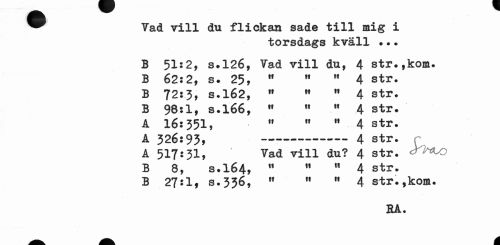 //// ^ Vad vill du flickan sade till mig i //// torsdags kväll *.. //// B 51*2, s.126, Vad vill du, 4 str.,kom. //// B 62:2, s. 25, " H M 4 str. //// B 72:3, s.162, w m » 4 str. //// B 98:1, s.166, M M M 4 str. //// A 16:351, " " " 4 str. //// A 326:93» ----4 str. //// A 517s3l, Vad vill du? 4 str. //// B 8, s.164, " M " 4 str. //// B 27:1, s.336, " " w 4 str.,kom. //// EA. ////