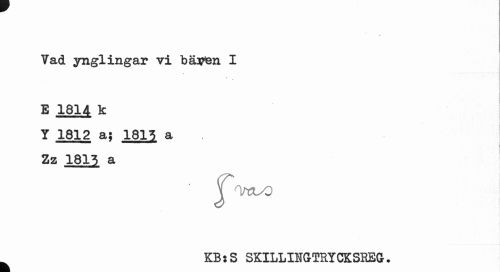 //// i //// Vad ynglingar vi bäaten I //// / //// E 1814 k //// Y 1812 a; 1813 a Zz 1813 a //// J^rzyO //// KB: S SKILLINCrTBYCKSREG. //// fe. ////
