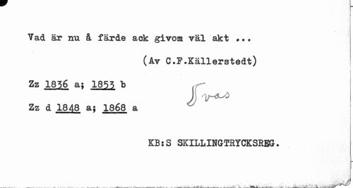 //// , v //// Vad är nu å f ärde ack givom väl akt ... //// (Av C.F.Källerstedt) //// i //// * //// Zz 1856 aj 1855 b //// Jj //// Zz d 1848 a; 1868 a //// KB:S SKILLINGTHYCKSREG. ////