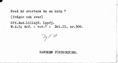 //// L //// l //// | //// r [ //// Hvad är svartare än en korp ? \ //// j //// (frågor och svar) j //// i //// Eft.Ånd.Lillsjö. Lppfj. | //// W.4.5; def. - var.? - Del.II, nr.900. //// L //// I-¦ //// | //// RANCKEN FÖHfECKIIHG. i //// j ////