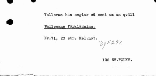 //// Vallevan han seglar så sent om en qväll 1^^ Wallewans förklädning. //// Nr#71f 20 str. Mel.not. //// 97 //// 100 SV.FOLK?. ////