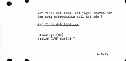 //// Var finns det land, dit ingen smärta når Den evig oförgänglig säll het rår ? //// Var finns det land ... //// Slimminge,(Sk) 84:126 (LUF 84?128 ?) //// L.U.F. ////