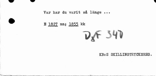 //// Var har du varit så länge .«. //// E 1827 nnj 1855 kk //// KB:S SKILLINGTRYCKSREG. ////