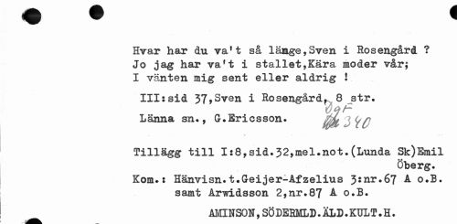 //// Hvar har du va11 så lämge,Sven i Rosengård ? Jo jag har va*t i stallet,Kära moder vår; I vanten mig sent eller aldrig 1 //// III:sid 37,Sven i Rosengård, 8 str. Länna sn., (J.Ericsson. Ékå^C //// Tillägg till 1:8,sid.32,mel.not.(Lunda Sk)Emil //// Öberg. //// Kom.: Hänvisn.t.Geijer-Afzelius 3:nr.67 A o.B. //// samt Arwidsson 2,nr.87 A o.B. //// ai€INSON, SÖ DERMLD. iLD. KUL T. H. ////