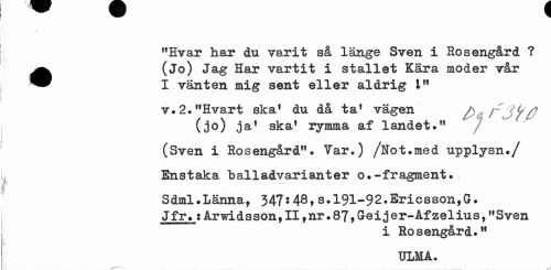 //// A //// "Hvar har du varit så länge Sven i Rosengård ? //// • (jo) Jag Har vartit i stallet Kära moder vår //// I vanten mig sent eller aldrig 1" //// v. 2. "Hvart ska» du då ta* vägen P T ifyf //// (jo) ja! ska1 rymma af landet»11 //// (Sven i Rosengård". Tar.) /lot.med upplysn./ //// Enstaka "balladvarianter o .-fragment.. //// Sdml.Länna, 347:48,s.191-92.Ericsson,G. Jfr.:Årwidsson,II,nr.87,Geij er-Afzelius,"Sven //// i Rosengård." //// ULMA. ////