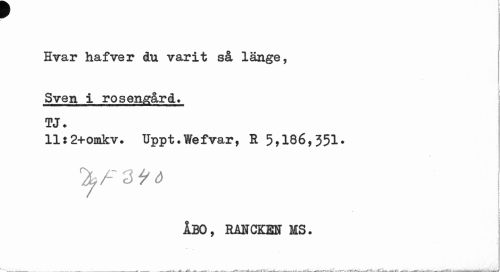 //// r //// Hvar hafver du varit så länge, //// . //// Sven, i rosen&ård. TJ. //// 11:2+omkv. Uppt.Wefvar, B 5,186,351. //// ty f //// ÅBO, RMCKM MS. ////
