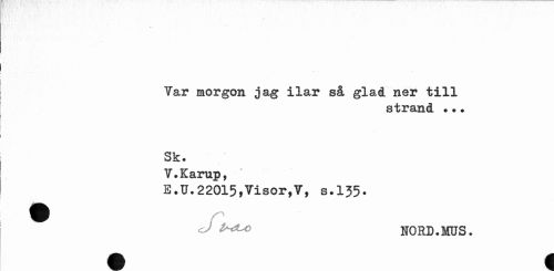 //// Yar morgon jag ilar så glad ner till //// strand •.. //// Sk. //// V.Karup, //// E.U.22015,Visor,V, s.135» //// NORD.MUS. ////