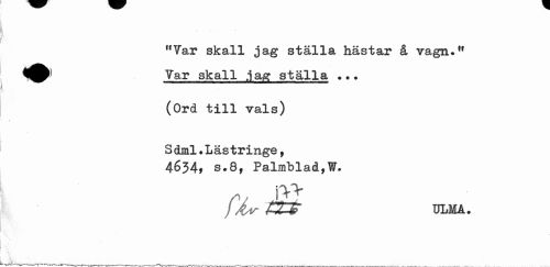 //// M7ar skall jag ställa hästar å vagn." Var skall jag ställa ... //// (Ord till vals) //// / //// S dml.Läs tringe, 4634* s.8, Palmblad,¥. //// J23: //// /y&r ULMA. //// 'V //// > //// y, //// 1; . ////