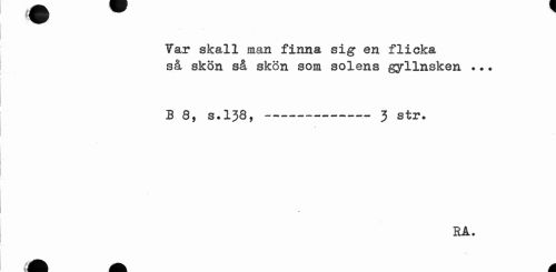 //// Var skall man finna sig en flicka så skon så skön som solens gyllnsken .?. //// 3 8, s.138, ---3 str. //// rå. ////