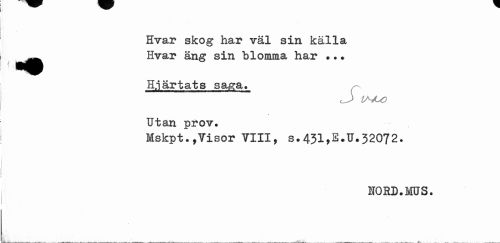 //// Hvar skog har väl sin källa ^^^ Hvar äng sin blomma har •. • //// Hjärtats saga. //// J> tAJLO //// Utan prov. //// Mskpt.»Visor VIII, s.431,E.U.32072. //// NORD.MUS. ////