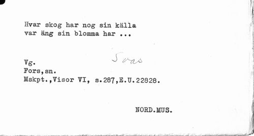 //// Hvar skog har nog sin källa 1 //// var äng sin blomma har .. ? //// t //// * i //// Vg. ^ ^TL^ //// Fors,sn. //// Mskpt.,Visor VI, s.287,E.U.22828. //// J //// NORD.MUS. j ////