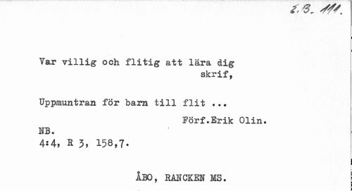 //// ér V?^ //// ^ I //// Tar villig och flitig att lära dig //// skrif, //// Uppmuntran för barn till flit ... //// Förf.Erik Olin. //// HB. //// 4:4, 1 3, 158,7. //// ÅBO, E1HOKEN MS. I ////