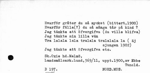 //// Hvarför gråter du så mycket (bittert,1900) Hvarför fälla(?) du så många tår på kind ? Jag tänkte att öfvergifva (du ville blifva) Jag tänkte min lilla vän //// Tra lalala lala tralala tralalala la ( äj //// sjungen 1902) Jag tänkte att öfvergifva etc. //// A Sk.Oxie hd.Malmö, //// L andsmåls ark.Lund. 369/11, uppt.l900,av Ebbe //// Tuneld. //// D 197. NOHD.MUS. ////