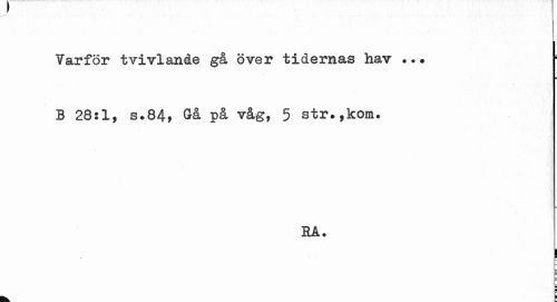 //// Yarför tvivlande gå över tidernas hav //// ¦ //// B 28:1, s.84, Gå på våg, 5 str.,kom. //// RÅ. //// ¦ //// p //// k. h ////